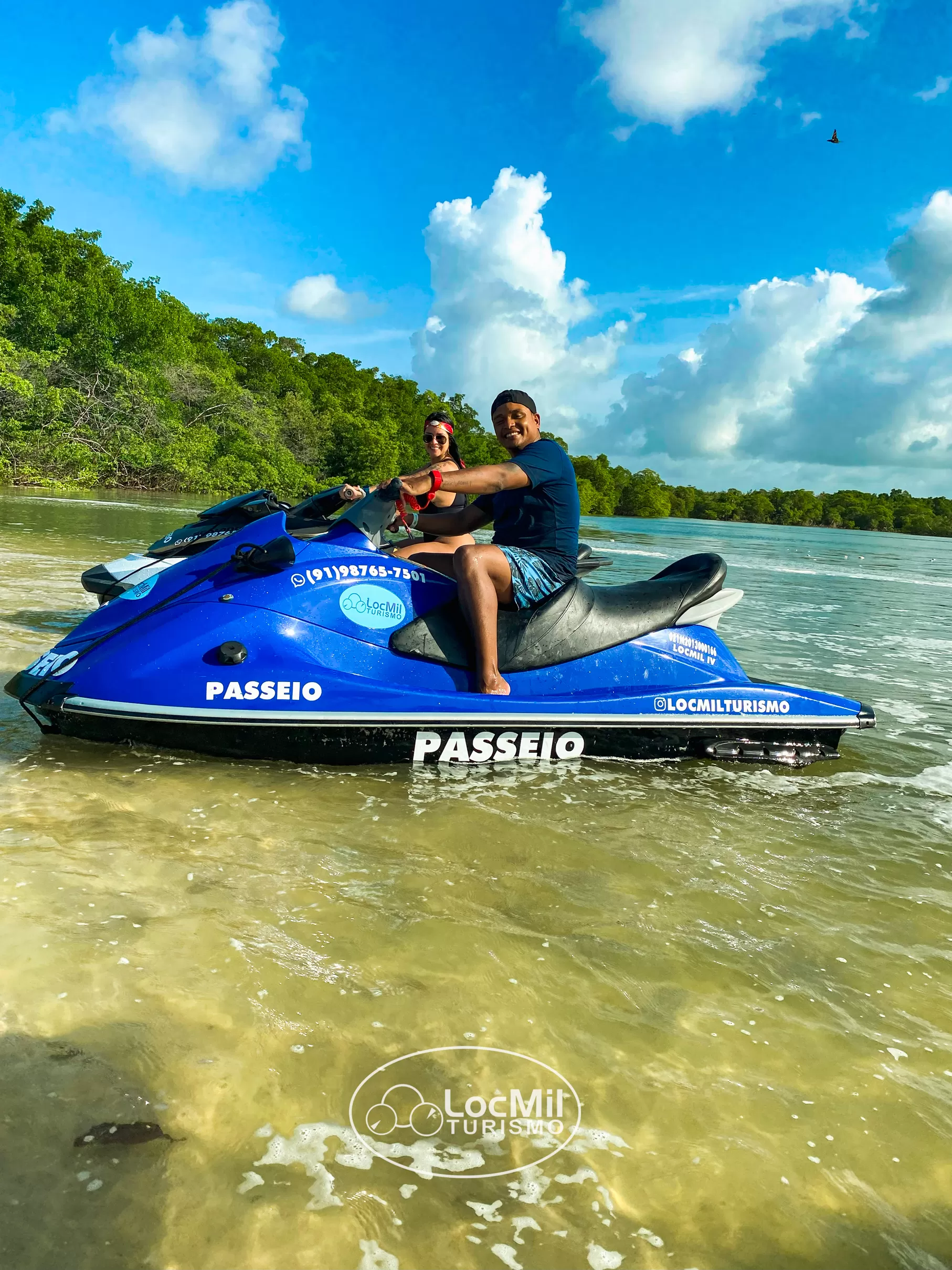 A experiência dura aproximadamente 60 minutos, com lotação máxima de 2 pessoas por jetski e acontece em horários de maré alta, garantindo o melhor trajeto e segurança na navegação.